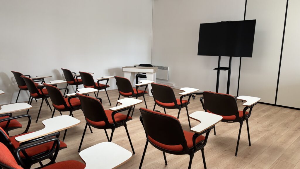 Elle dispose de tables modulables, de chaises de formation et de sièges classiques pour s’adapter à toutes les configurations.
